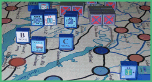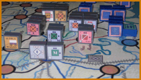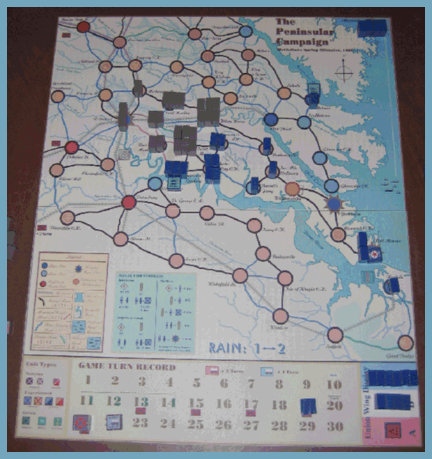 ![]() The Peninsular Campaign is an operational level game using the block unit system to re-create the limited intelligance of the actual campaign. Players maneuver their forces without adequate knowledge of their opponents strengths or even location. The game board covers the actual and potentional topography of McClellan's offensive operations in the Spring of 1862; from the rugged hills covering Richmond's southern approach and the swamplands covering its northeast approach to the protective confines of the C.S.S. Virginia's base port of Norfolk. A point to point movement system is employed on a 20 x 24 playing map. Limited command abilities and critical supply wagons are key to managing your armies and achieving victory.